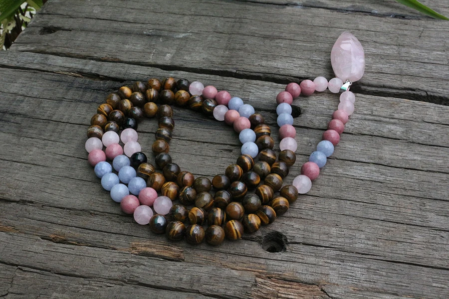 Le mala est composé de rhodochrosite qui augmente l’amour-propre, le pardon, la confiance. Il aide à guérir la douleur émotionnelle, équilibre les émotions et stimule le chakra du cœur.